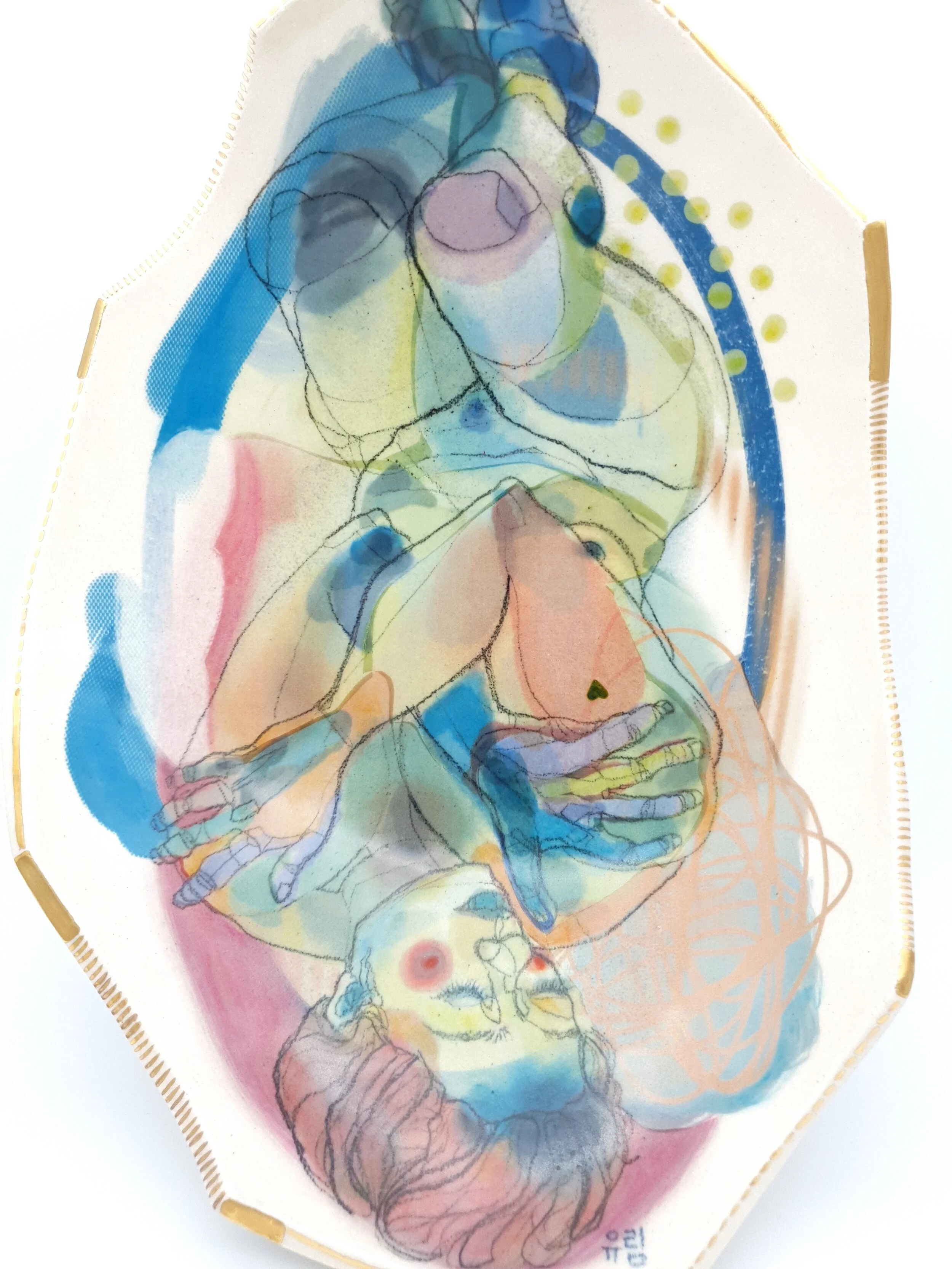 Life drawing on stoneware with ceramic pencil, ceramic transfers, gold, porcelain pens, and 3D-PRINTED part.