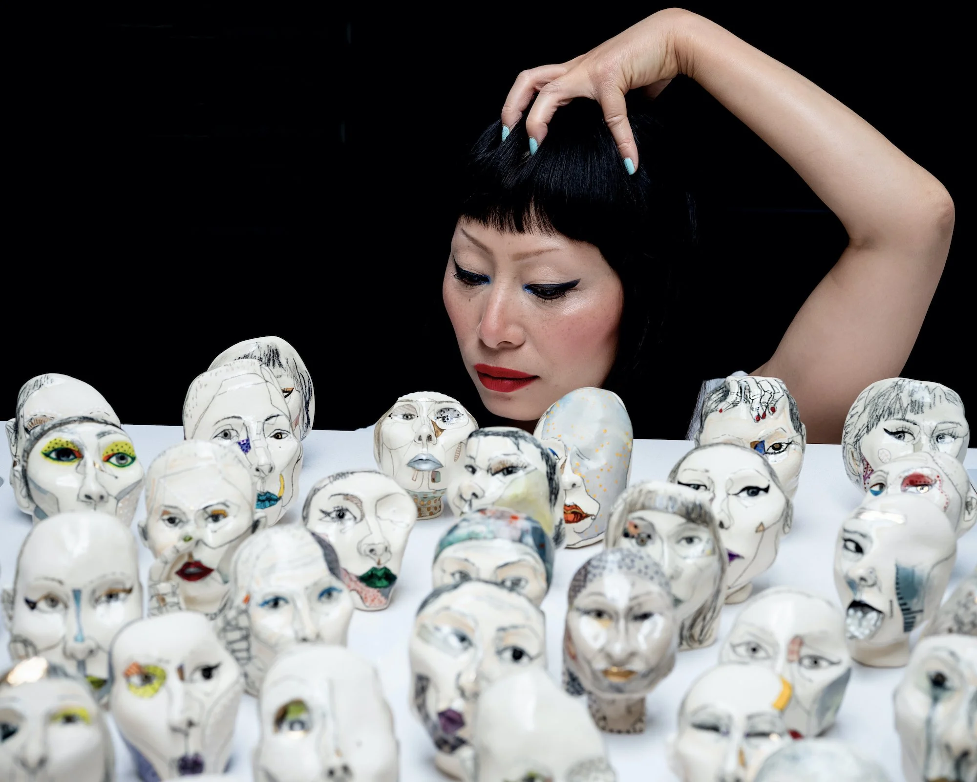 Photograph of Yurim Gough with ‘Army of Me’ ceramic heads. Photo credit: Daniele Roberts Mah